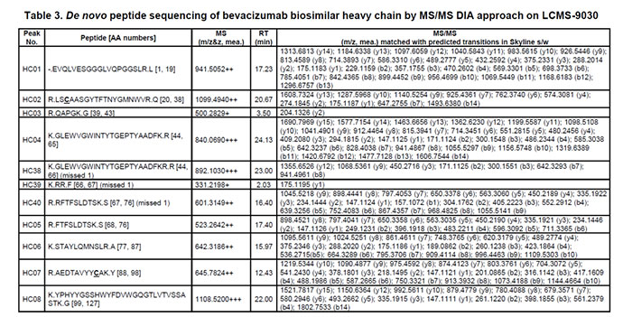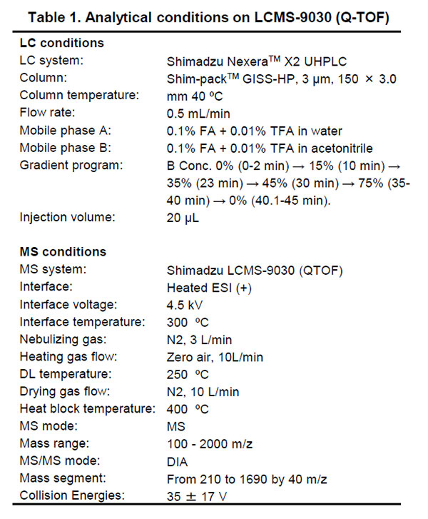 岛津分析bevacizumab 生物类似药序列分析,通过Shim-pack GISS-HP色谱柱(3um,150*3.0 mm),可以高效分离酶切后的轻重链肽段,最后用LC-MS 9030 进行一级和二级扫描,最佳参数色谱质谱参数如下表所示。