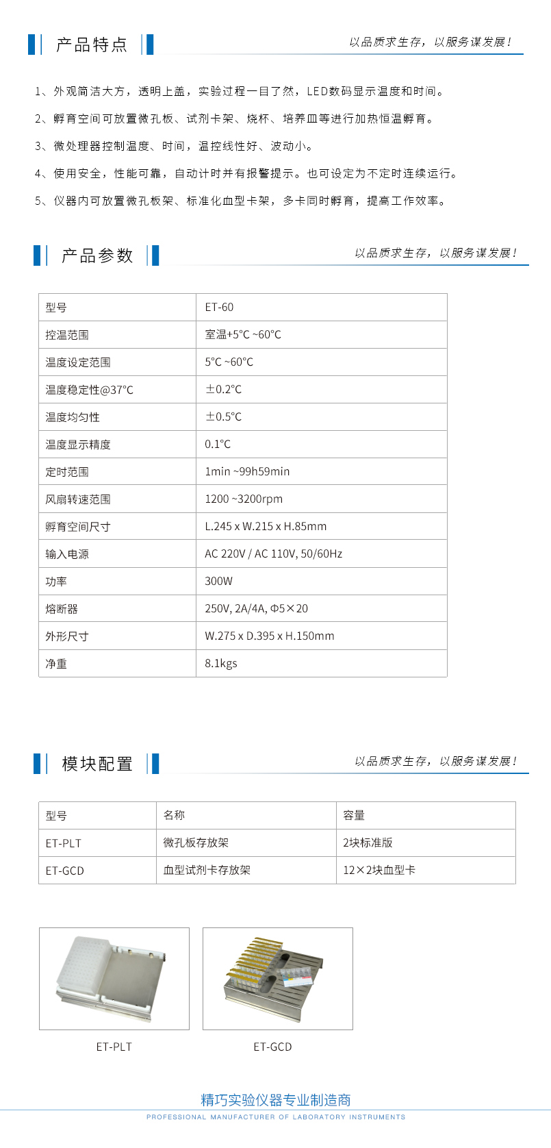 ET-60恒温孵育器产品型号:ET-60产品描述:ET-60恒温孵育器采用微处理技术结合PID控制方式而形成的多用途恒温孵育器。适用于酶标板、细胞培养板、血型试剂卡、烧杯、培养皿等载体内溶液在设定温度下进行培养孵育。